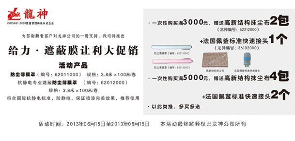 一次性購買滿5000元,贈送高新結構抺塵布(龍神編號:62212000)4包+法國佩釜標準快速接頭(龍神編號:36102000)2個