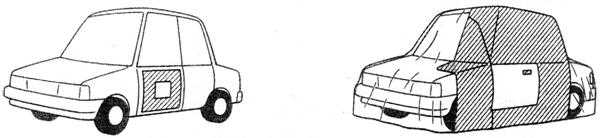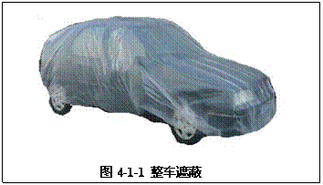 汽車修補噴涂時,為了保護修補部位以外范圍不受漆霧、灰塵的污染,因此就要對非修補區域進行覆蓋保護,這就是所謂的遮蔽。遮蔽是非常重要的工作,所有部分修補涂裝(包括點修補、點擴展修補和區域修補)在噴漆前,都要對噴涂區域周圍的區域進行遮蔽保護,修補面積較大或點較多時還需進行整車遮蔽(如圖4-1-1。有時在清除修補區域舊涂膜的作業和研磨、拋光等作業時也需要對相關部分進行遮蔽保護。
