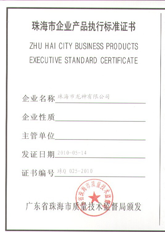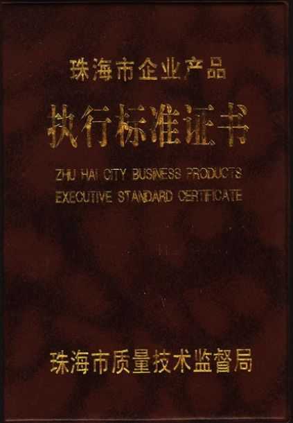 珠海市企業產品執行標準證書
